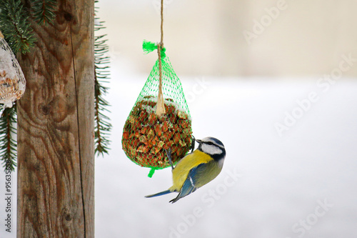 © sasimoto, Fototapeta premium The Eurasian Blue Tit bird (Parus Caeruleus, Blaumeise) perching on a meshed bag full of nut with snow covering during the Winter in Europe