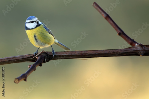 Obraz premium The Eurasian blue tit (Cyanistes caeruleus) sittink on the branch with a greenish gray background