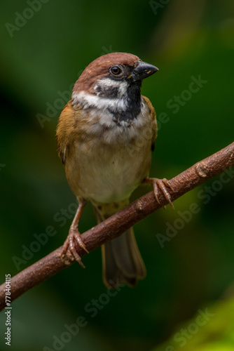 Naklejka premium The Eurasian tree sparrow (Passer montanus) is a passerine bird in the sparrow family with a rich chestnut crown and nape and a black patch on each pure white cheek