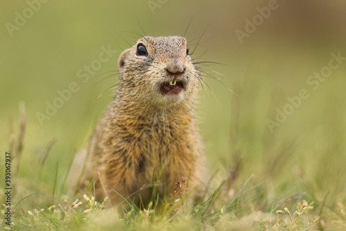 Fototapeta premium The European ground squirrel (Spermophilus citellus), also known as the European souslik, is a species from the squirrel family, Sciuridae. Cute, fast and clever animal. Endangered too.