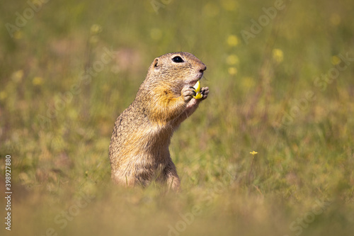 Fototapeta premium The European ground squirrel (Spermophilus citellus) is a species from the squirrel family, Sciuridae. Very funny, cheerful, curious and also endangered animal. Running and hiding on a meadow.