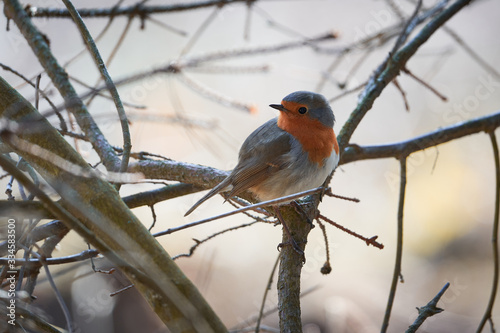 Fototapeta premium The European robin, Erithacus rubecula, known simply as the robin or robin redbreast sitting on the stick of the bush in sunny winter morning. European robin is a small insectivorous passerine bird.