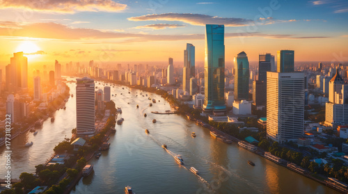 © SecretCanvas, Fototapeta premium The evening cityscape glows warmly as tall buildings and a shimmering river rest beneath a beautiful blueish orange sky and calm atmosphere birdview landscape aesthetic photo