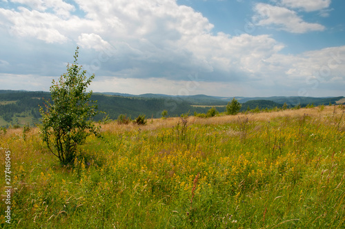 Obraz premium The evening is bright in the mountains in the summer with green forest