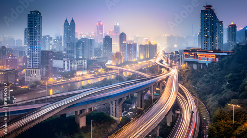 © Generative AI, Fototapeta premium The expressway and the modern city skyline are in Chongqing China : Generative AI
