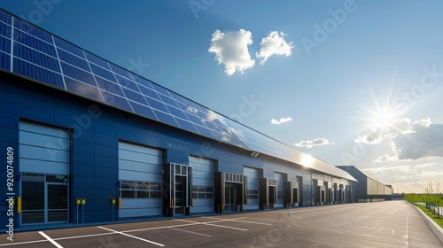 Fototapeta premium The exterior of a modern warehouse facility, designed with sustainability in mind. Solar panels and energy-efficient systems reflect a commitment to reducing the environmental impact of warehousing.