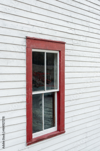© Dolores Harvey, Fototapeta premium The exterior of an old white wooden shed wall with a red framed closed glass double hung window. In the window is a reflection of the sky and you can see green rope stacked inside the building.