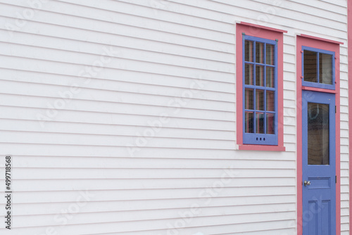 © Dolores Harvey, Fototapeta premium The exterior wall of a white wooden cape cod clapboard siding house with a purple panel door and vintage glass window, black metal hinges, pink trim around the door, and white snow on the step.