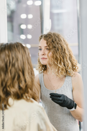 © Marina, Fototapeta premium The eyebrow master works with the client. The girl performs the procedure of coloring her eyebrows. The concept of the salon and the eyebrows.