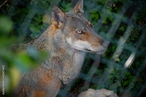 Fototapeta premium The eyes of a young wolf inside an observatory