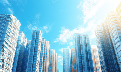 © fanjianhua, Fototapeta premium The fa ç ade of modern skyscrapers and glass curtain wall buildings in the city
