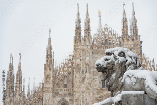 Fototapeta premium The facade of the famous Milan Cathedral under a heavy snowfall. Lion statue...