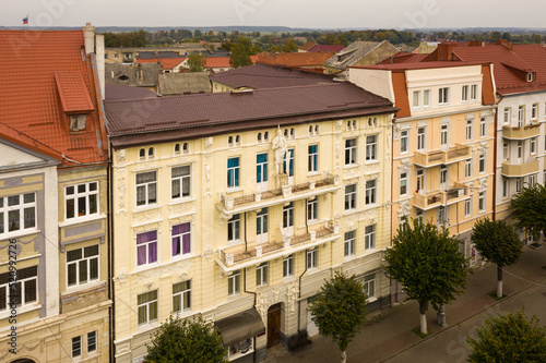 Fototapeta premium The facades of the buildings in Sovetsk, view from a drone