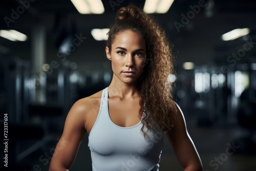 Fototapeta premium The Face of Strength: A Sweaty Female Athlete Post-Workout in a Contemporary Gym Setting