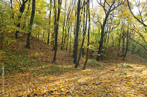 © ID1974, Obraz premium The fallen down leaves on the earth in autumn wood