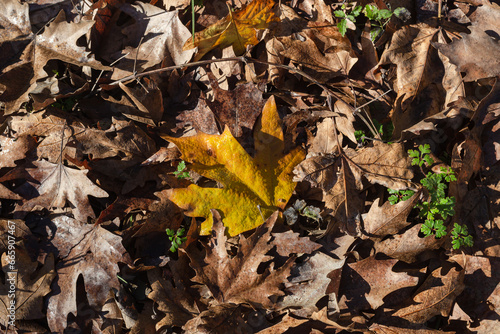 Fototapeta premium The fallen leaves in autumn forest at sunny weather
