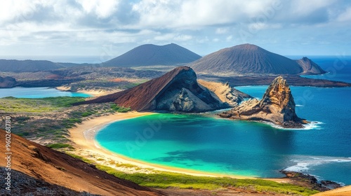 © Theeranan, Naklejka premium The famous Pinnacle Rock at Bartolome Island, with turquoise waters and sandy beaches in the foreground.