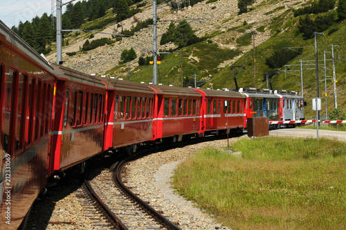 © Dan74, Naklejka premium The famous swiss mountain red train Bernina Express from Tirano to St.Moritz during summer season