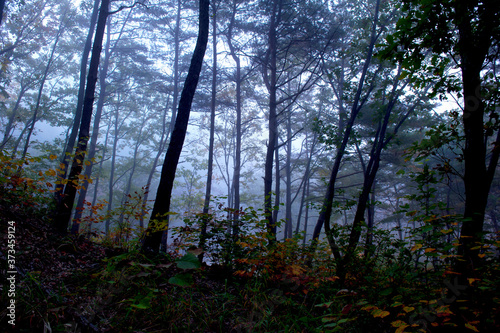 © Chongbum Thomas Park, Obraz premium The Fantastic and Mysterious tyndall effect sunlight come down at autumn forest.