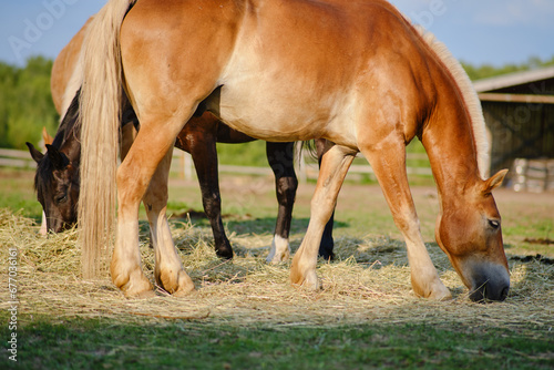 Obraz premium The farm animals, horses, dine on the nutritious hay bales in the pasture, surrounded by the beauty of nature
