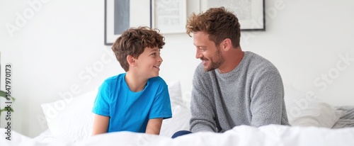 © Studio Nova, Obraz premium The father and son sharing a joyful moment together on a bright bedroom bed