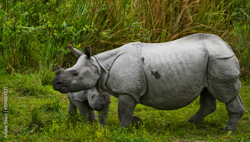 Naklejka premium The female Great one-horned rhinoceroses and her calf. India.