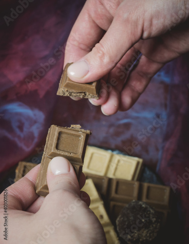 Fototapeta premium The female hands holding a handmade chocolate.Confectionery on a dark...