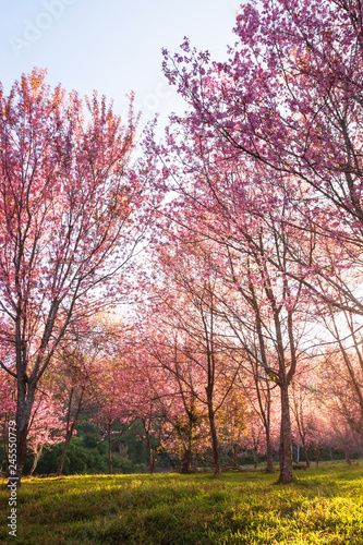 Naklejka premium The field of blossoming pink Wild Himalayan cherry flowers (Thailand's sakura or Prunus cerasoides), known as Nang Phaya Sua Khrong in Thai at Phu Lom Lo mountain, Loei, Thailand.