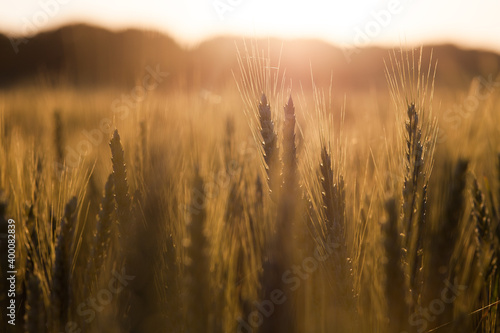 Obraz premium The field of golden wheat in setting sun, beautiful landscape with a blurry background