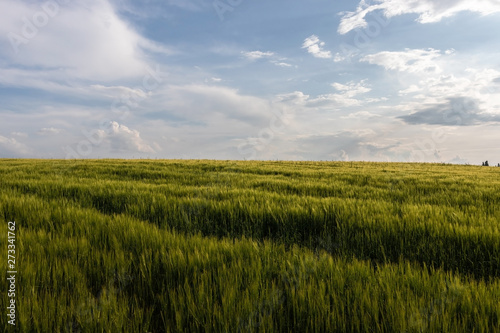 © Vitaliy, Obraz premium The field of green oats is enlightened by the evening sun under the blue sky with white, shining clouds.