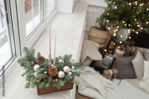 © malkovkosta, Obraz premium the finished version. Workshop of Christmas decor with their own hands. Christmas wooden box with fir branches for the holiday. The new year celebration. Master class on making decorative ornaments