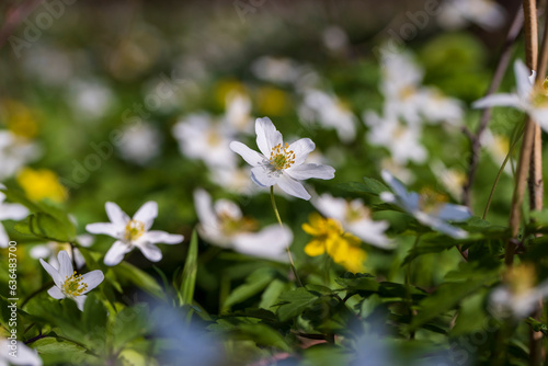 Obraz premium the first spring flowers of anemone are white in a mixed forest