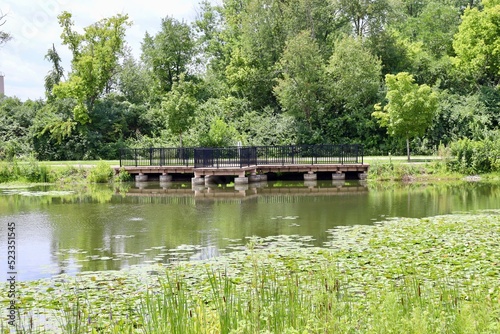 Fototapeta premium The fishing dock at the pond on a sunny day.