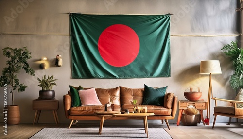 © Daniel, Obraz premium The flag of Bangladesh hangs in the living room at home. The flag is in house.