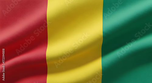 © MUSTAKIM, Fototapeta premium The flag of guinea waves gently, its vertical stripes of red, yellow, and green embodying the nations unity, progress, and hope for the future, a vibrant emblem of guinean identity