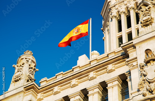 Fototapeta premium The flag of Spain fluttering on the Cybele Palace, Madrid