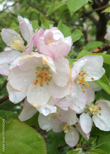 Fototapeta premium The flowers of the apple tree are white and pale pink with raindrops; garden...