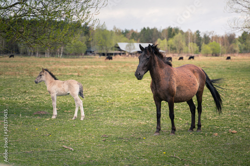© mahod84, Fototapeta premium The foal and mare run in the meadow.