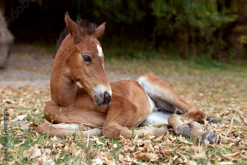 © Aleksandra, Fototapeta premium The foal lies on the grass.