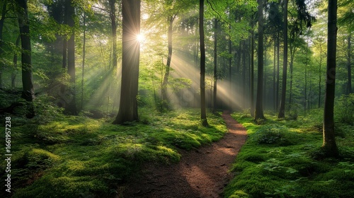 Obraz premium The forest is particularly beautiful in spring when the bright sunlight filters through the trees