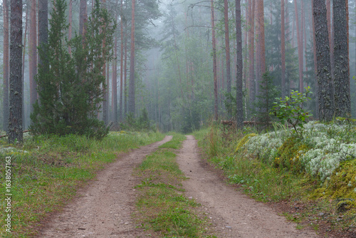 © talavietis, Fototapeta premium The forest path leads into the morning mist