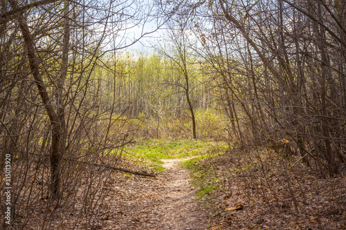 Obraz premium The forest road through the bushes,branches and trunks of trees