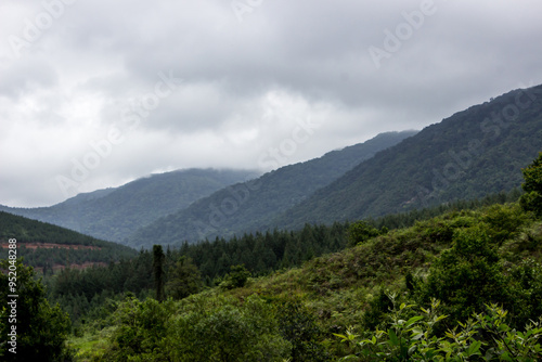 Fototapeta premium The forested mountains of Magoebaskloof, with their peaks hidden by rainclouds.