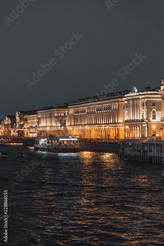 Naklejka premium The formal architecture of St. Petersburg. The bridges and the river Neva embankment. Sunset over the city.
