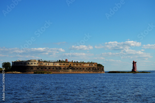 Naklejka premium The fort is old destroyed in the waters of the Gulf of Finland off the coast of Kronstadt. Russia, St. Petersburg, 17.08.2020