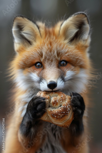 © alenagurenchuk, Fototapeta premium The fox cub is eating a sweet roll