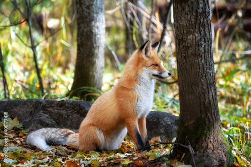 Obraz premium The fox sits among trees and stones and looks into the distance