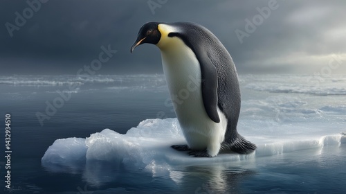 © stefanholm, Fototapeta premium The fragility of nature visualized. This photorealistic image uses a penguin on fragmented ice as a powerful metaphor for habitat loss and global warming. Ideal for awareness campaigns.