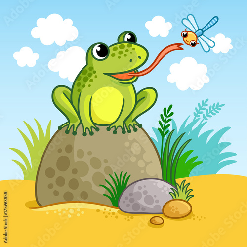 © svaga, Obraz premium The frog sits on a large rock and catches a dragonfly. Cute vector illustration of a cartoon style.