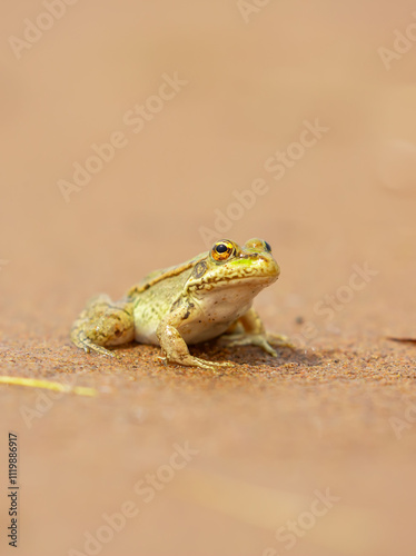 © Vera, Obraz premium The frog sits on the sand on the shore of the lake. Beautiful wildlife landscape with place for text. The concept of protecting wildlife and ecology.